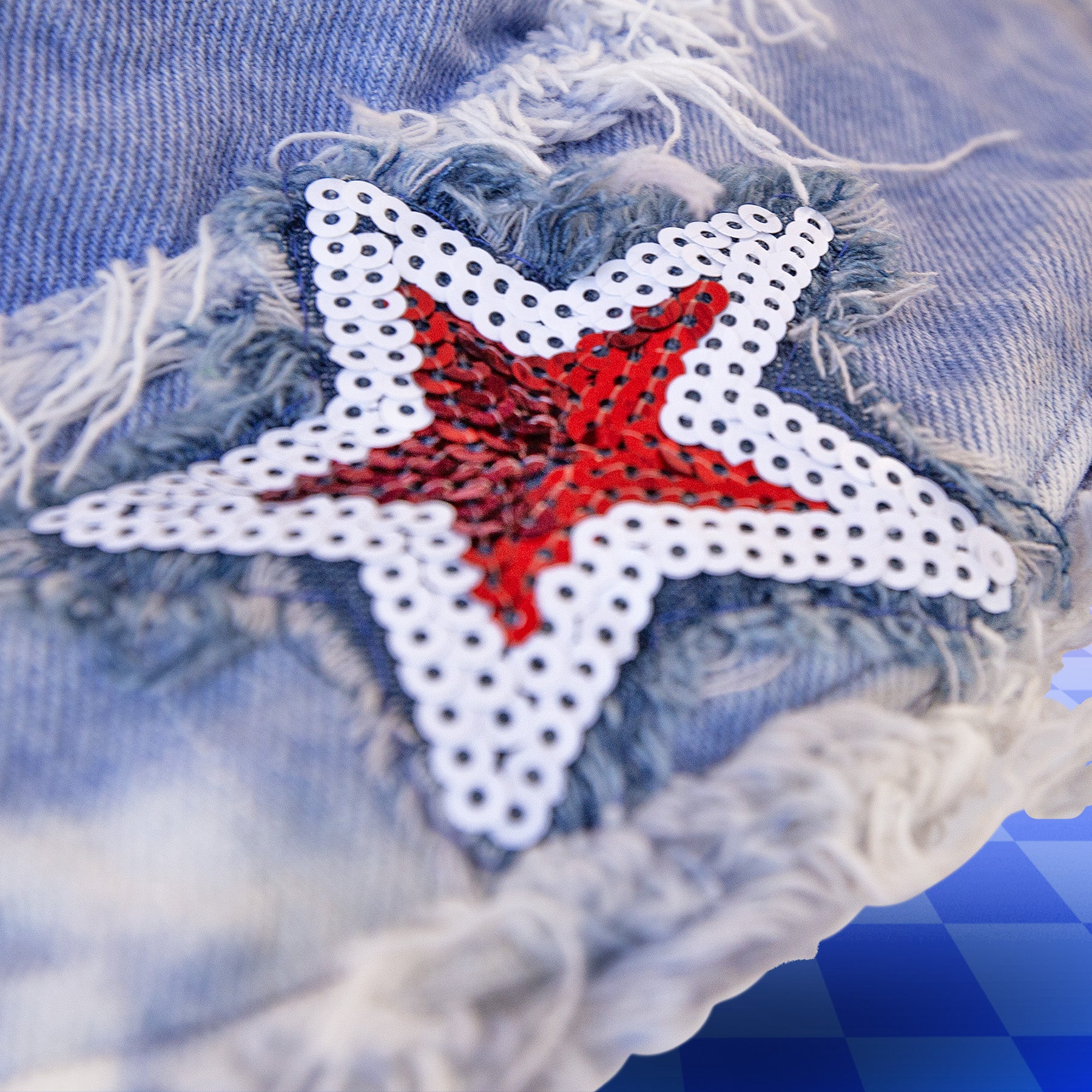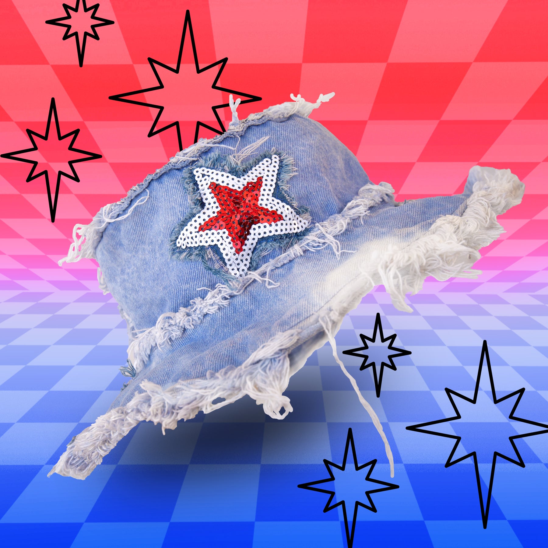 Featuring 5 red and white sequined "STARS" mounted on shaggy frayed dark blue denim all around the brim. Her featured base is one of our Classic Wash Denims or custom OG Fade Tie Dye single color fade from vibrant to light. Constructed with massively frayed denim edges, & a wire insert through the brim to keep her poppin' all night long!