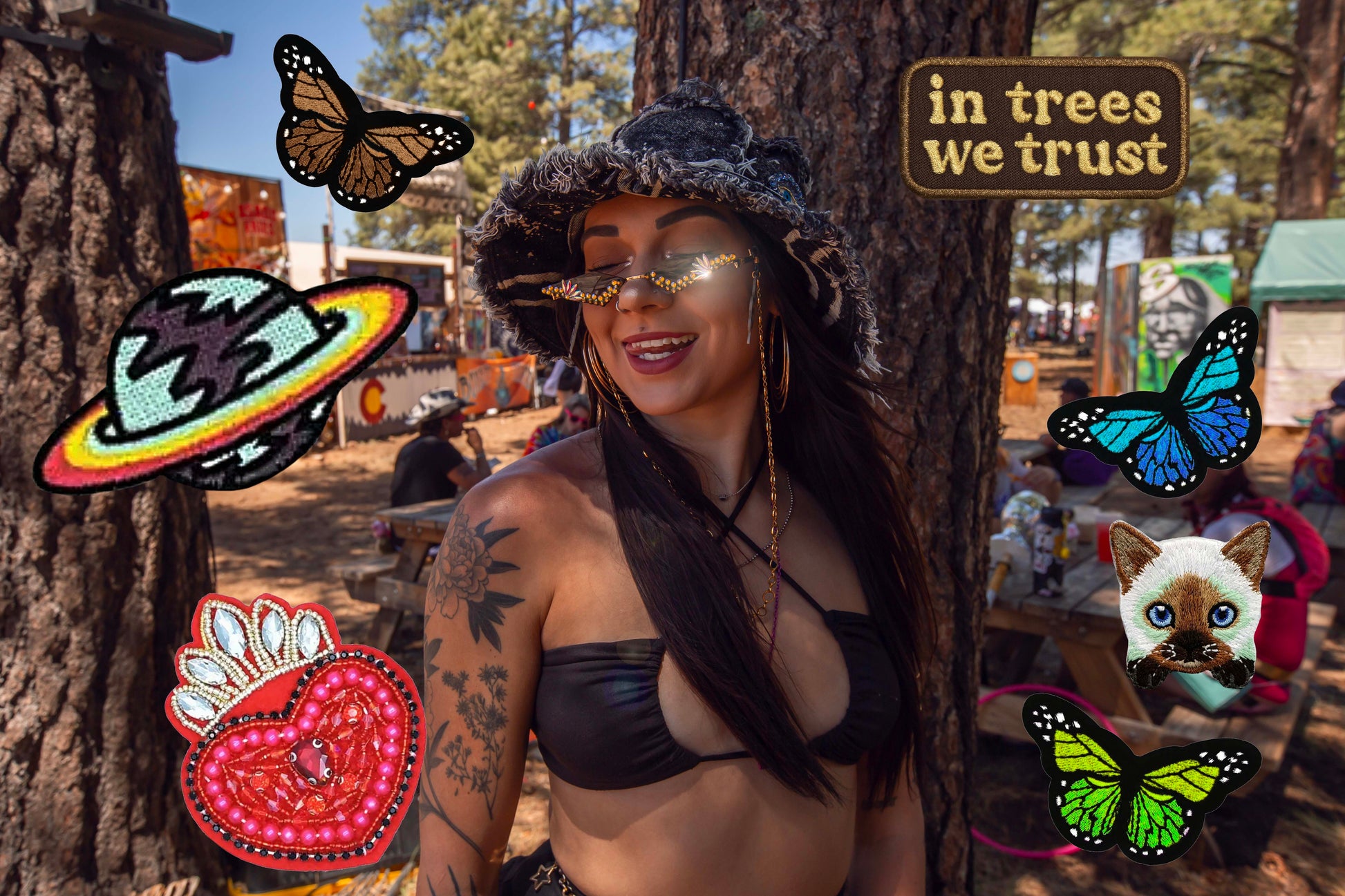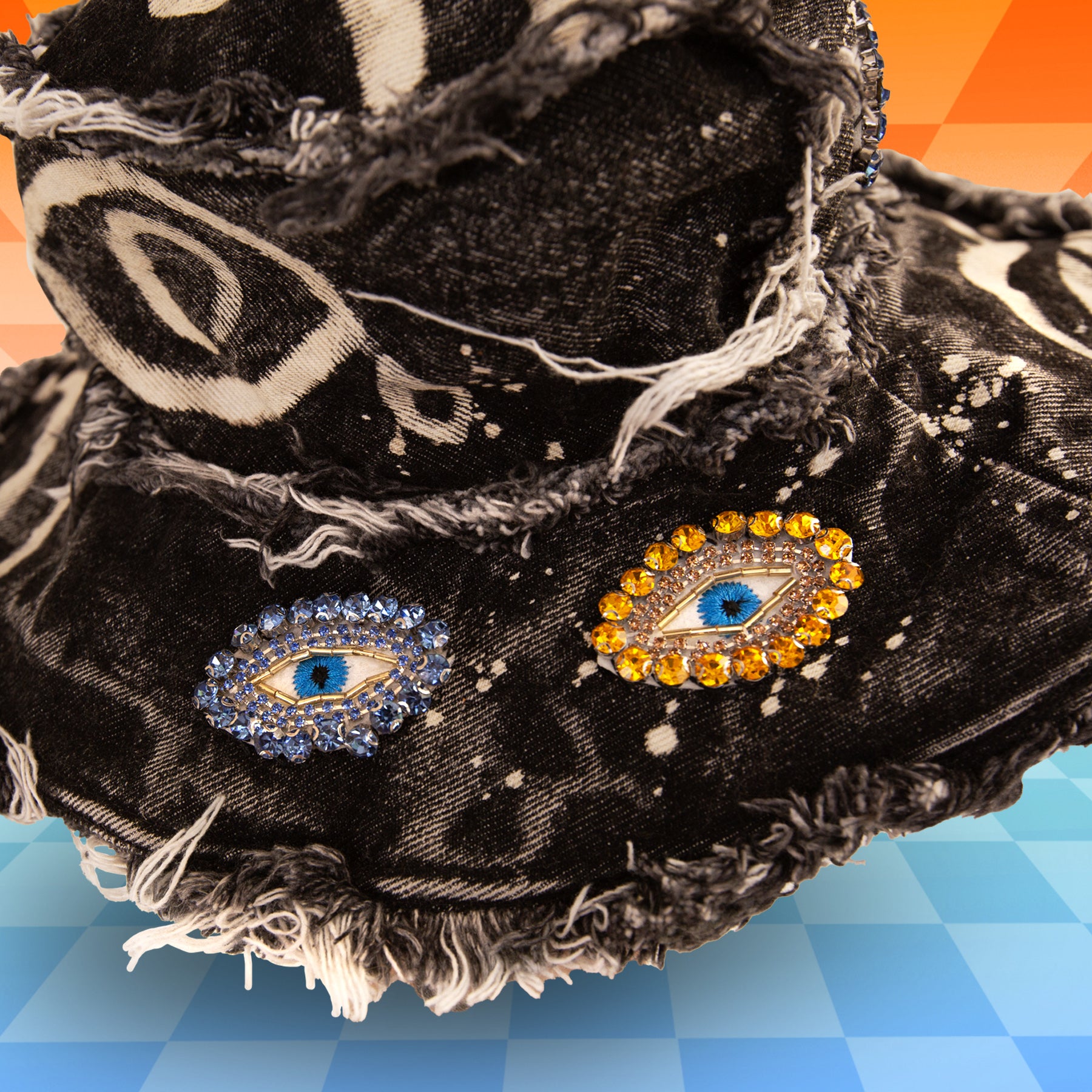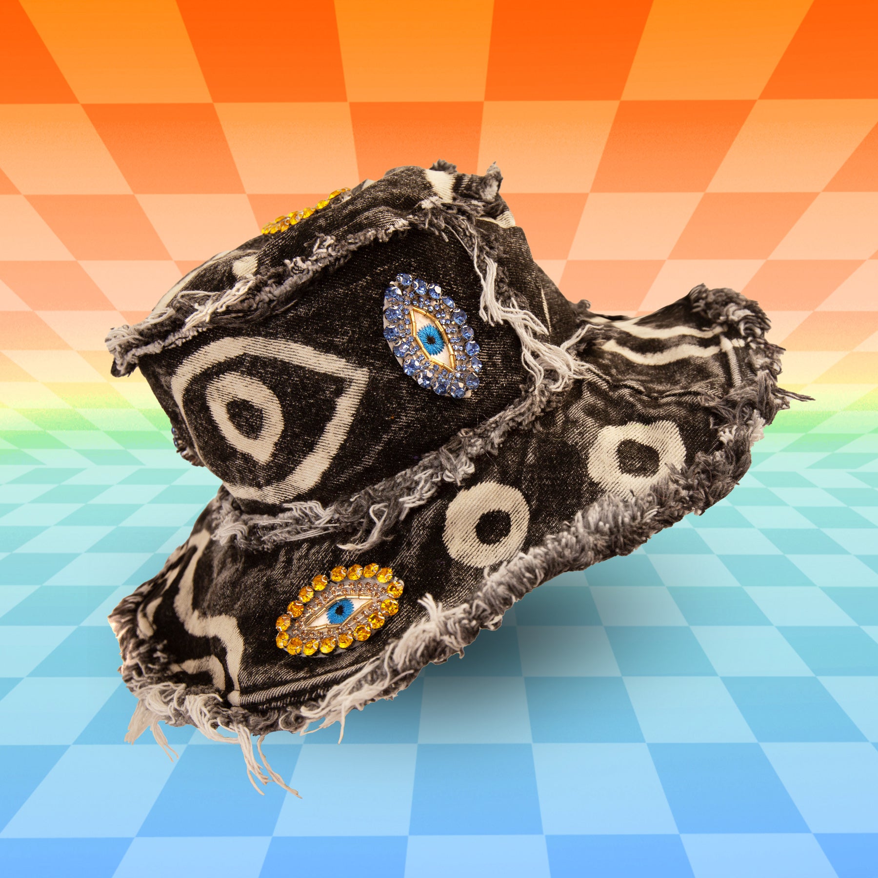 Bleached & painted with love, she constructed with massively frayed denim edges, & a wire insert through the brim to keep her poppin' all night long. Each will be a unique variation of third eyes painted on with circles and swirl squiggle lines, very organic and flowing, with evil eye jewel patches sewn on or swapped out to tiny butterfly patches (dealer's choice!) ποΈπ¦