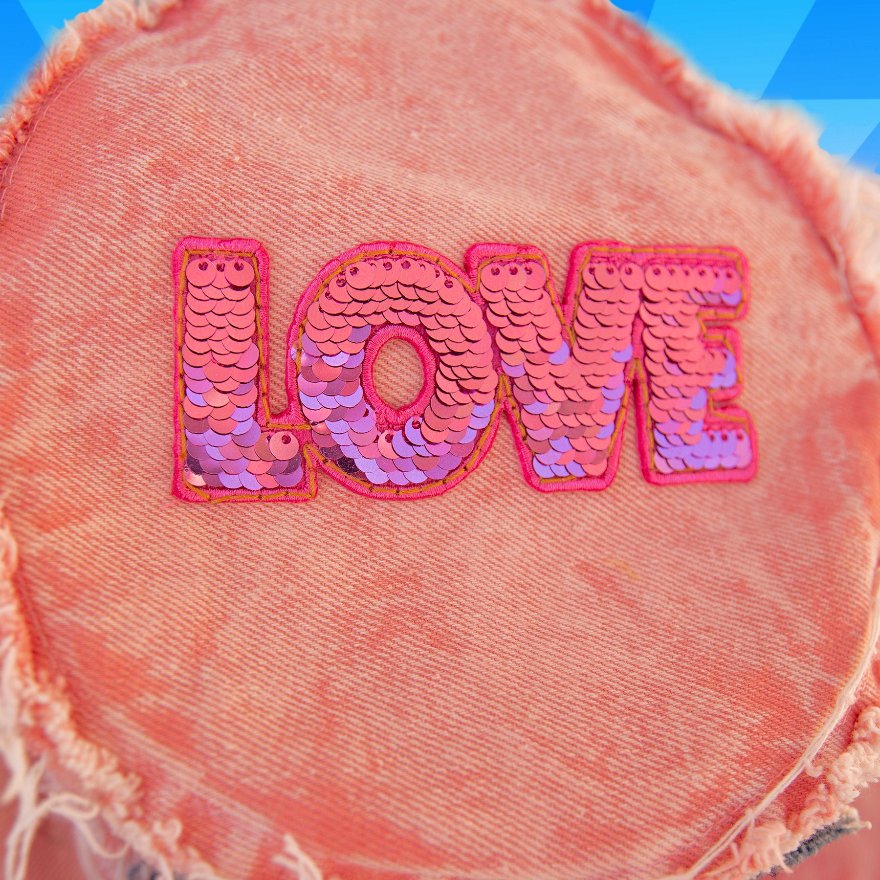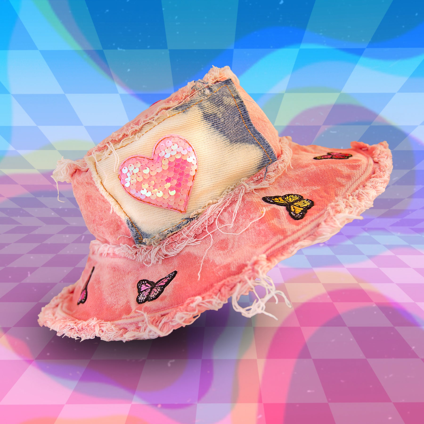 Featuring a "LOVE" pink sequin patch on the top, a random colored sequin heart back patch & bleach dye denim patches, with butterflies all around the brim. Her base is one of our OG Fade Tie Dye single color fade from vibrant to light, or classic denim, or a bleach dribble hat. Constructed with massively frayed denim edges, & a wire insert through the brim to keep her poppin' all night long!