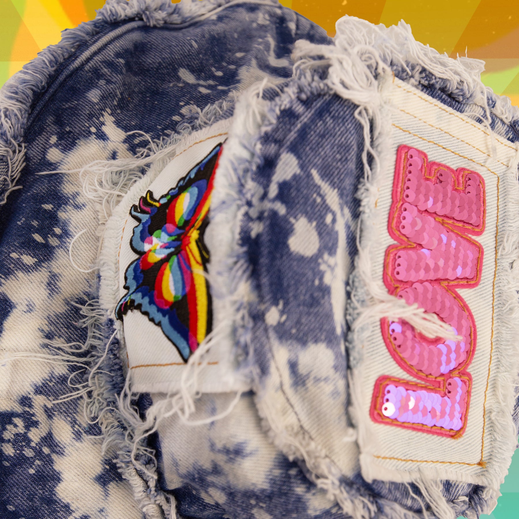 Featuring a sequin "LOVE" patch on top + a front Butterfly pocket patch!! 🦋 Her base is one of our OG Fade Tie Dye single color fade from vibrant to light, or our classic denim, or one of our bleach dribble hats. Constructed with massively frayed denim edges, & a wire insert through the brim to keep her poppin' all night long!