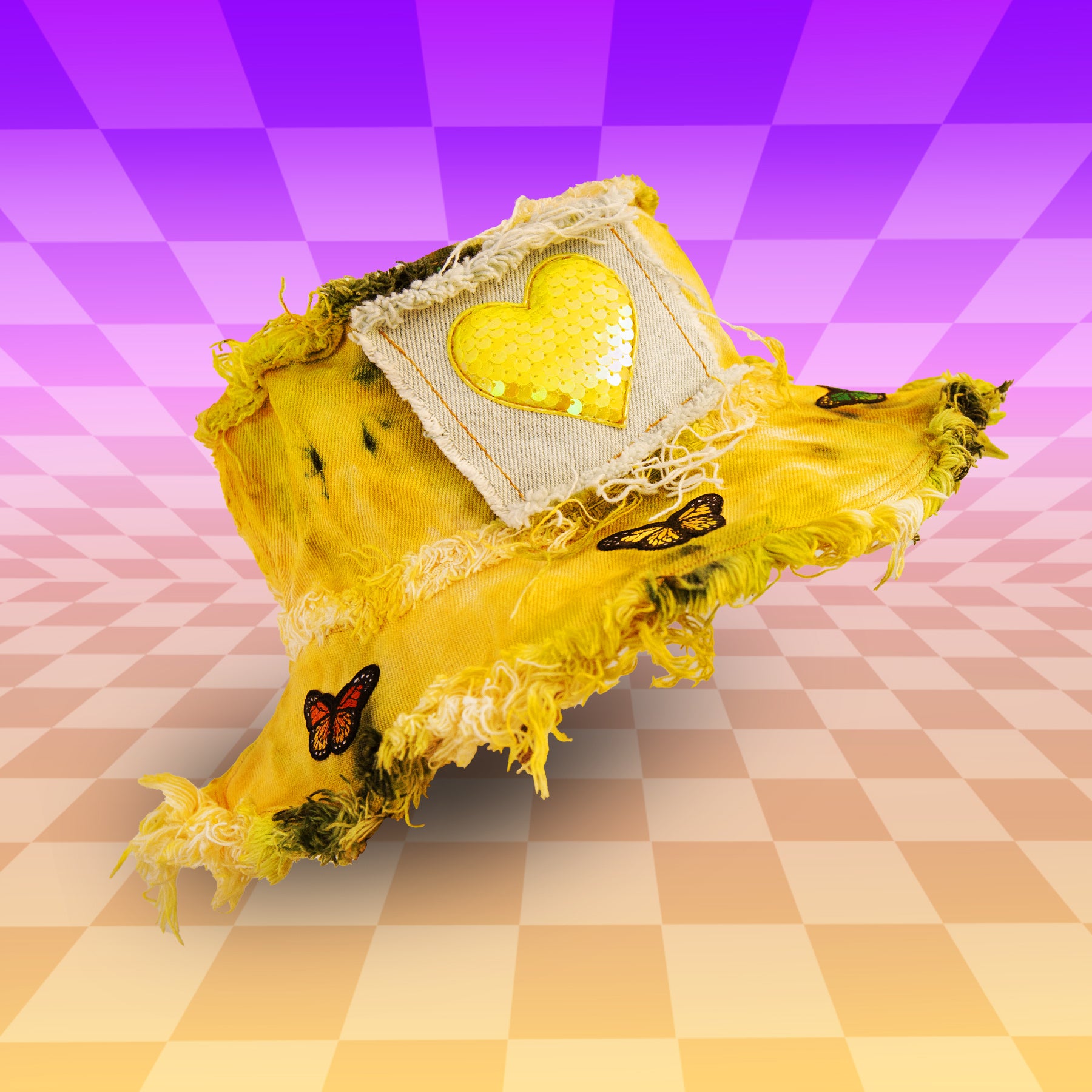 Featuring Butterflies all over, with bleach dye denim patches, a Jewel Snake & multicolor butterflies all around the brim. Her base is one of our Triple Tie Dyes, this means you pick your base color and pops of 2 other colors will be added. Constructed with massively frayed denim edges, & a wire insert through the brim to keep her poppin' all night long!
